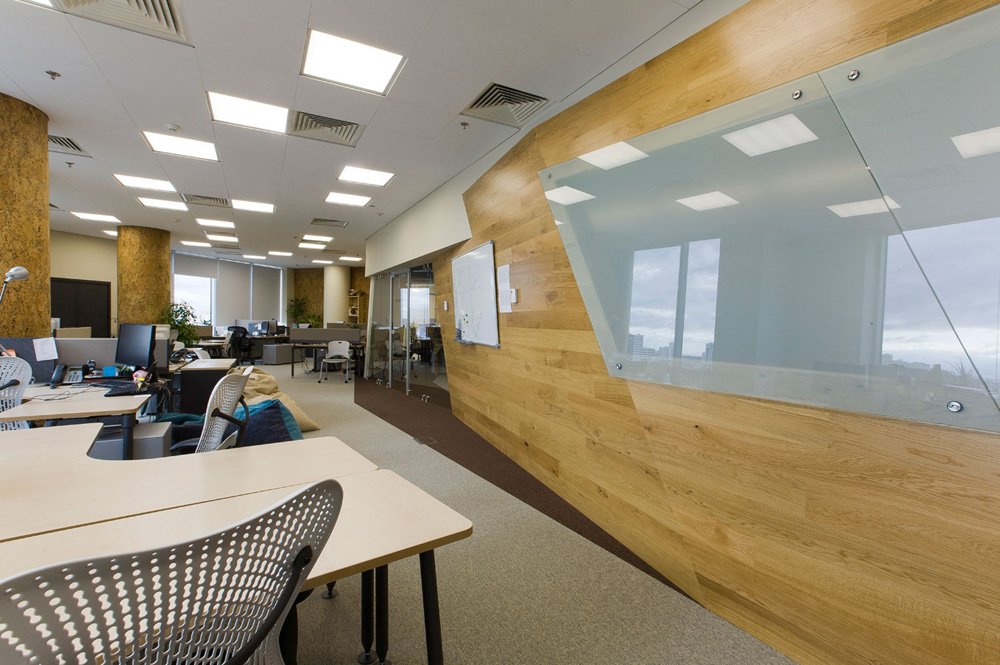 該場地呈方正矩形,因此設(shè)計圍繞中心使用功能而布局。首先必要的功能是衛(wèi)生設(shè)施,然后是其它必備的空間比如廚房與咖啡間,這些功能空間都有對水的需求。布局上,設(shè)計師保留了建筑原有的框架,不同的房間沿著走廊串了起來,透明的玻璃內(nèi)墻使整個空間變得柔和,橙色涂料的使用則為黑白灰的整體風格增添了一絲明快。走廊頂面從視覺上比實際層高要高些,工作區(qū)吊頂采用影院級的吸音材料,以減低環(huán)境噪音。互聯(lián)網(wǎng)線以及電線管道隱藏于架空地面,上面覆以地毯,這樣便于網(wǎng)絡(luò)的接口。雖然平面呈矩形,但在立面的處理上采用動態(tài)的斜面,以此豐富空間形態(tài)。