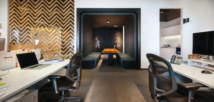 開放式工作區(qū)和建設(shè)的核心–本身的包裹封閉的會(huì)議空間是一個(gè)循環(huán)的–走廊4m幅寬和對(duì)比地板的顏色給它運(yùn)行軌道的感覺之間的象征。