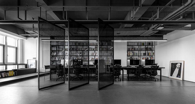 1、暗黑系辦公室設(shè)計裝修:整體是地板、黑色玻璃、大理石、乳膠漆、木板等材料,辦公室設(shè)計師弱化了辦公區(qū)域的劃分,諸如格子間、工位、會議室等固化名詞,切合共享辦公的概念,工作人員有**的自主權(quán),用以保持獨(dú)立空間內(nèi)的思考,動線設(shè)計又為不同部門創(chuàng)造交疊互通的機(jī)會。沒有過多形式化的東西,不局促,不局限。滿目是基本線條結(jié)構(gòu)縱橫空間,以大面積通透的玻璃取代墻面,剝離而裸露天花原本的形態(tài),混凝土地面與木材質(zhì)友好拼接,黑白調(diào)的純粹辦公場所開敞,無距離感,兼具個性與實用性。斑駁銹鋼板以謙卑的姿態(tài)為空間帶來不可思議的力量感與藝術(shù)氣息。書籍,藏品以陣列式收納,不限于多元化體驗濃縮在室內(nèi)空間里,更多的是成為使用者發(fā)現(xiàn)內(nèi)在美好的空間載體。