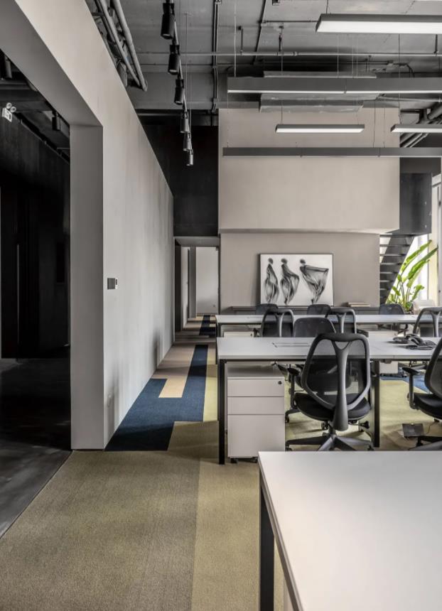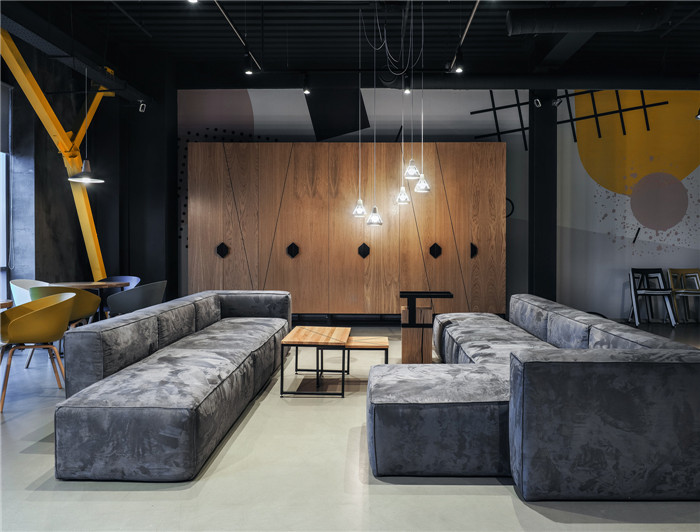 3、工業(yè)風(fēng)暗黑系辦公室設(shè)計:極富張力的空間構(gòu)建、精彩的造型和圖形設(shè)計、暗黑色調(diào)中的藝術(shù)配色,整個空間在視覺的張力中呈現(xiàn)出工業(yè)時代的厚重感和當(dāng)代理念的時尚感。建筑內(nèi)部以槽鋼構(gòu)架呈現(xiàn)出原始粗獷的工業(yè)魅力,張弛有度的空間體量以及混凝土和木飾面又帶來親切的現(xiàn)實感。直白的空間構(gòu)建,加以色彩的輔助所產(chǎn)生的力量感和輕盈感,使整個空間充滿著視覺的張力和優(yōu)雅靈動的藝術(shù)氣韻。室內(nèi)以開闊的木樓梯引導(dǎo)的中軸線規(guī)劃功能布局。木樓梯不僅緊密連接上下兩個樓層,也是多元化的活動中心,面向?qū)?cè)的咖啡吧臺,形成一處大型社交集會中心。在這條中軸線上還設(shè)有許多共享會議室等一眾輔助空間。中軸線兩側(cè)是工作區(qū),既有開放的共享工位,也有各種比例的獨(dú)立工作間。在整個暗調(diào)的氛圍中,設(shè)計團(tuán)隊以一抹亮黃驚艷了整個視覺!再加以深深淺淺優(yōu)雅晴朗的藍(lán)色,猶如一首輕盈悅動的歌曲在空間流動。