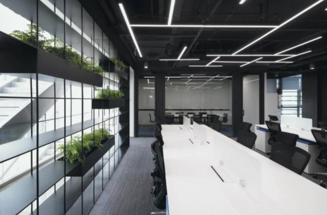 2、地產(chǎn)總部辦公室設(shè)計裝修,既有極強(qiáng)的現(xiàn)代感,又用簡約的設(shè)計手法強(qiáng)調(diào)了企業(yè)高效、專業(yè)、務(wù)實的特質(zhì)。為了凸顯空間的開闊與流動,大面積的配色以白色為主,例如地面及天花。天花為打破沉悶感利用黑色線條進(jìn)行分割。入口挑空的部分采用棕色的豎向木紋鋁板進(jìn)行突出強(qiáng)調(diào),也使得空間更有層次感。辦公空間設(shè)計的主要配色是黑白灰,利用橫縱交錯的線條及豐富多變的黑白灰,體現(xiàn)專業(yè)、高效、冷峻的形象。辦公空間的燈光設(shè)計也是這個項目中的一大特色,長短交錯的條形燈帶滿足辦公基本照明需求的同時,增加了空間的靈活性。采用4000k的辦公色溫,使人保持理性的工作狀態(tài)。