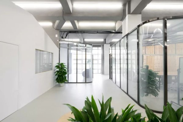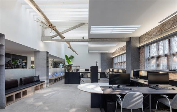 700平米的辦公室裝修設(shè)計:設(shè)計師們保留了老建筑的原始磚墻,只對吊頂做了百葉格柵的造型設(shè)計,與陽光順向的造型也起到了調(diào)節(jié)空間光線的作用,另外這個地方我們還吊掛了一棵一分為二的大樹。使用率較高的地方叫做“工作空間”,把較好的南北方向空間給到整個的工作空間,用較流暢的動線來組合這個部分。“肘部區(qū)域”是我們提出來的一個概念,這一部分區(qū)域完成的是企業(yè)合作伙伴在工作中的協(xié)同作戰(zhàn)訴求,其應(yīng)該被設(shè)置在有獨(dú)立出入口的中部空間?!靶蜗髤^(qū)域”是企業(yè)面對客戶的精神堡壘,我們會將其設(shè)置在空間的重點(diǎn)區(qū)位。在辦公室的后邊有一條單獨(dú)的樓梯通往樓下的茶室,也就是在一個30平米的位置中,又可以重新組成一個封閉的LOFT空間,滿足我一個人的創(chuàng)意設(shè)計和客人接待需要,這個算是留給自己的一點(diǎn)小私心。
