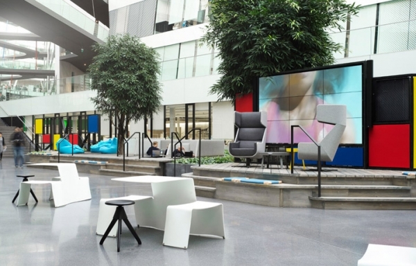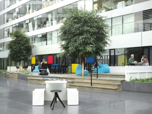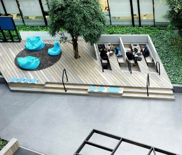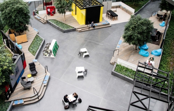 中庭空間通過自然溫馨的材質(zhì)、完全開敞的布局、以及充滿情感的人文設(shè)計(jì),讓這處空間與理性的建筑構(gòu)造呈現(xiàn)出強(qiáng)烈的視覺反差,加入了時(shí)尚潮流的辦公設(shè)計(jì)元素讓這里華麗蛻變。