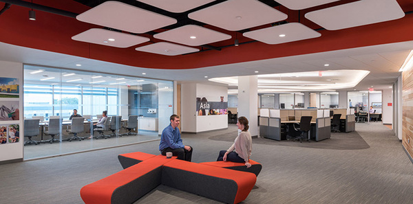 其辦公室裝修設(shè)計呈現(xiàn)出熱情洋溢、時尚活力的空間氛圍。躍動的色彩激發(fā)著人們的創(chuàng)意靈感;靈動的布局鼓勵員工的深度合作與交流;精彩的設(shè)計映射出Cimpress與時俱進(jìn)、不斷發(fā)展前進(jìn)的文化理念。