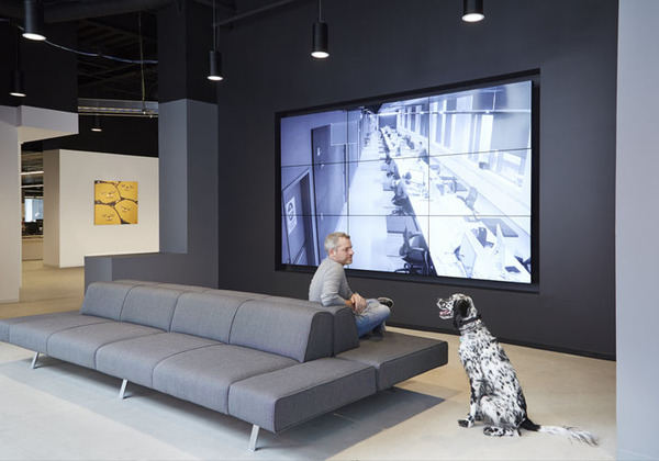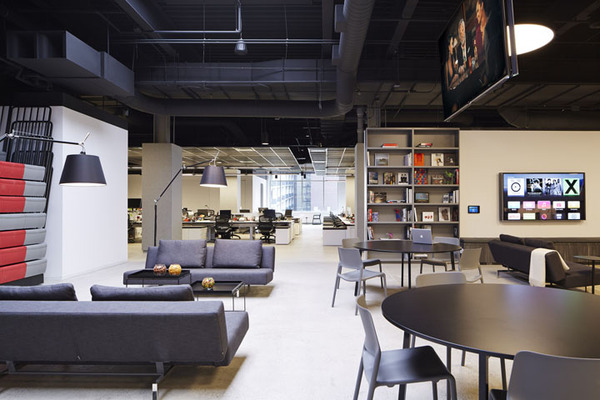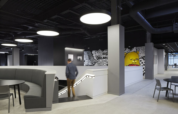 當然作為創(chuàng)意公司,這里還規(guī)劃了一處大型集會空間,用以全體員工的聚會等活動。各類創(chuàng)新座位區(qū),比如在大型集會區(qū)用作空間分隔的階梯看臺座椅等。室內(nèi)的裝飾表面也具有多功能性,比如墻體和結(jié)構(gòu)柱大量運用磁性玻璃、烤漆玻璃以及可黏貼或釘圖釘?shù)牟馁|(zhì),這樣可以隨時記錄創(chuàng)意構(gòu)想。