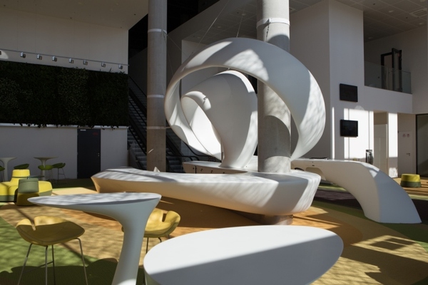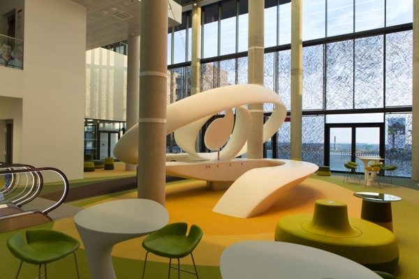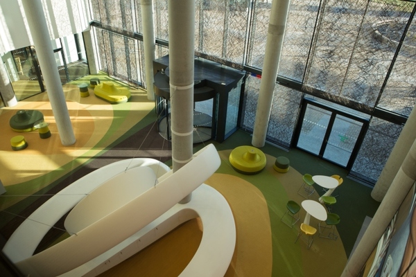 大廳和一樓之間的實體連接,是通過扶手電梯來完成的。大廳的南面采用玻璃幕墻,跟墻外的街道形成一種交互。中央那個形狀獨特的前臺接待桌,把大廳整個平面的布局規(guī)劃的像是一幅圖畫。設(shè)計師專門使用一些能夠給人帶來柔軟感覺的材料,比如人造的草皮,還有那些好像是生長在柱子和家具上的苔蘚和地衣。