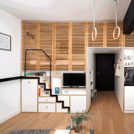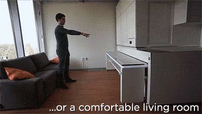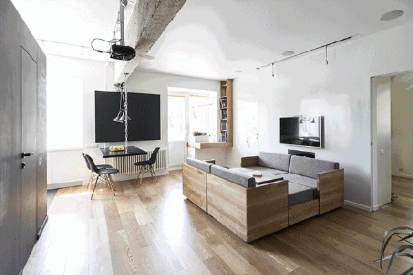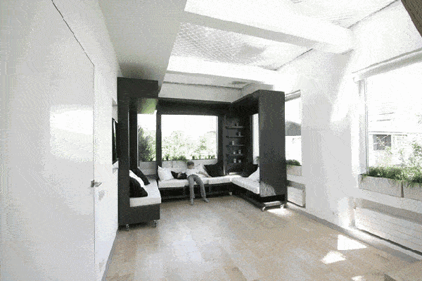 這面移動電視墻可以將整個空間隔離成五個空間。