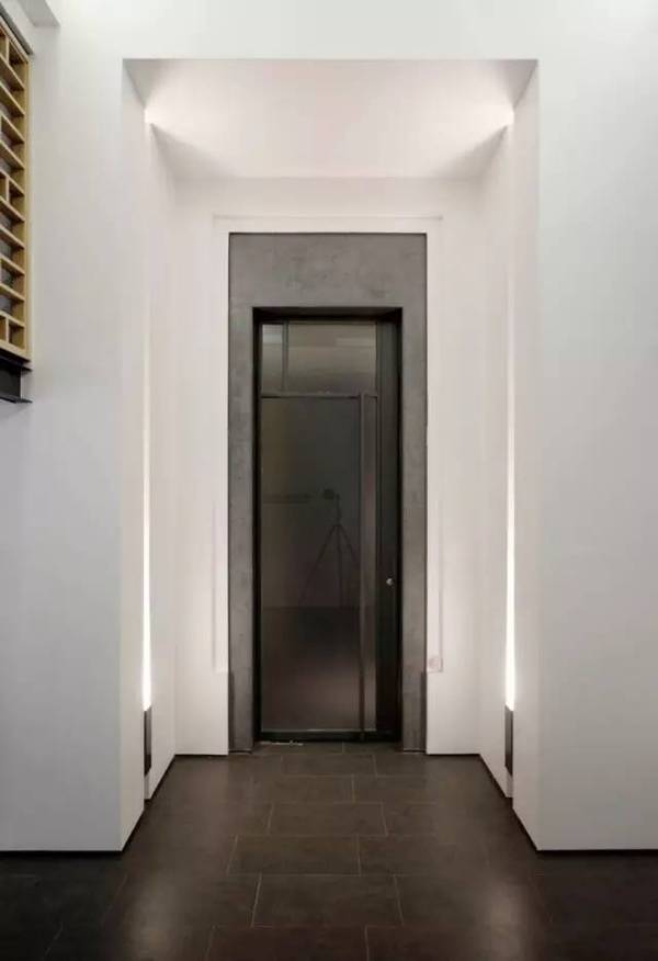 樓梯在中間往兩側分開,在高高的白墻中間,如同一道通往別處的裝置,吸引觀者登梯探訪。通過白墻和天花間露出的微光,可以看到白墻并未真正與墻接合,且邊緣用鋼條鑲嵌,展露出更鮮明挺拔的體塊形狀。為了提升空間的立體感,門廳沒有設置照明設備,唯有從遠處墻壁的燈柱迎來的淡淡白光,令觀者一進門即在這份寧靜中得到放松。
