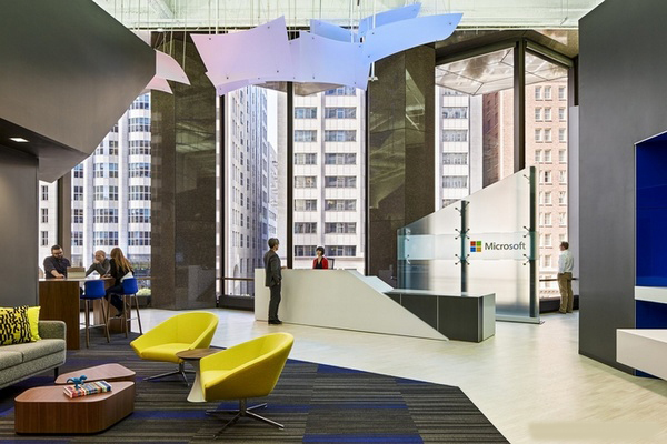 今天,上海辦公室裝修設計公司-領企裝飾要與大家分享的是,微軟集團位于美國舊金山的辦公室裝修設計。辦公室的樓面計劃利用了視野和微軟公司的商標來創(chuàng)造第一印象,既引人注目又能馬上被識別出來。目標是在人、場地和技術之間創(chuàng)造一個平衡。通過創(chuàng)造一個展示逐日變化的技術的陳列室,建成空間和技術之間的區(qū)別變模糊了。微軟公司的產(chǎn)品變成了帶領訪客穿過這個空間的車輪。