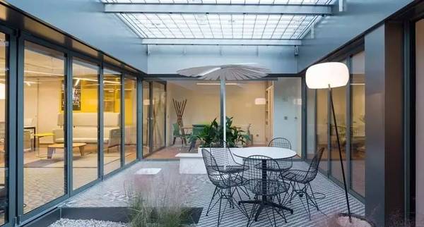 辦公室是建立在一個(gè)室內(nèi)的庭院之中的,雖然辦公空間是圍繞著室內(nèi)的小花園的,但事實(shí)上,室內(nèi)的設(shè)計(jì)與其說是辦公室倒更像是圍繞著小花園的休息和活動(dòng)空間。種植著綠色植物的露天小花園中擺放著用以休息閑聊的簡單的家具,綠色是這里的主題,而用以分隔小花園和辦公空間的既不是堅(jiān)實(shí)的墻壁,也不是活動(dòng)的玻璃門,設(shè)計(jì)團(tuán)隊(duì)選用了落地窗來包圍這個(gè)公司員工每天都在使用的戶外小空間,以此創(chuàng)造了室內(nèi)外空間的連續(xù)性。