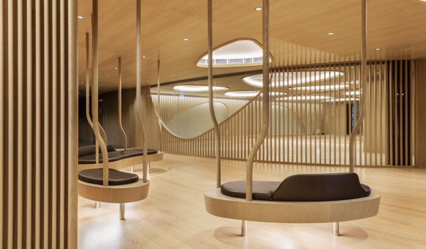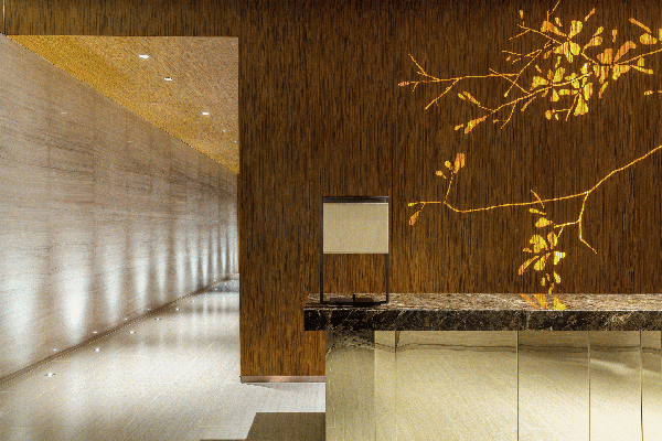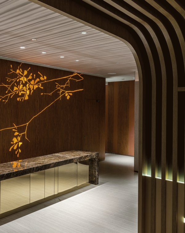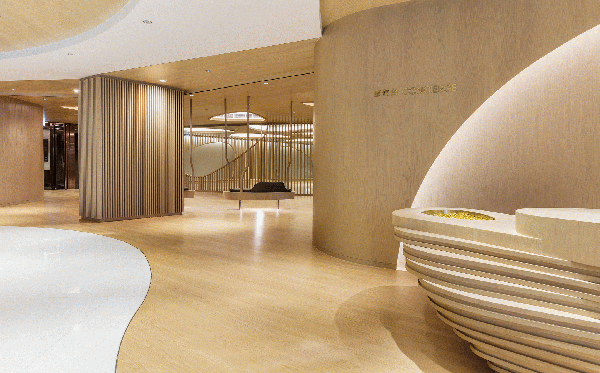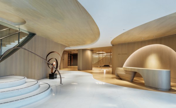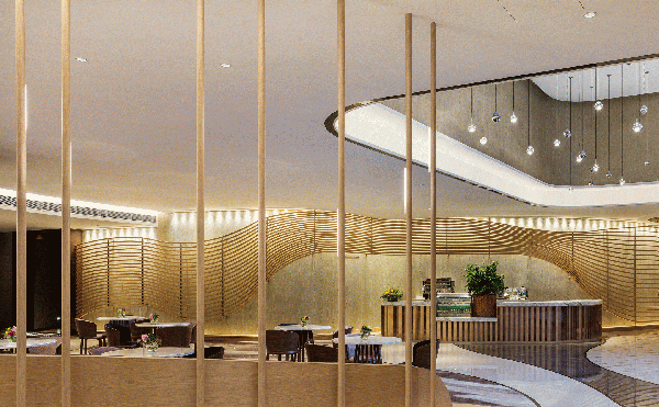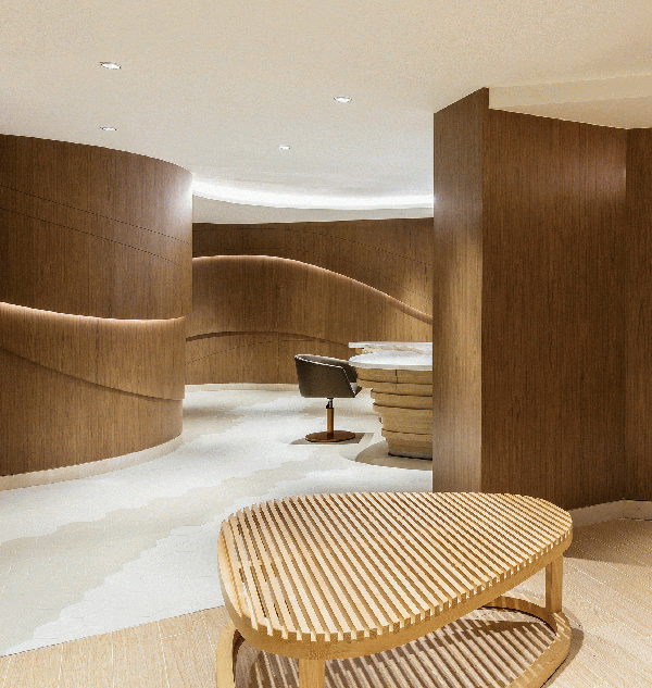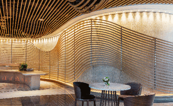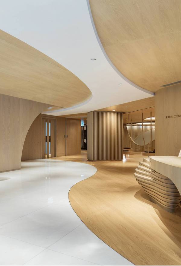 會所內(nèi)的木材不僅僅是結構性的支持,起伏有致的輪廓劃分出不同區(qū)域,優(yōu)雅的弧線跨越寬敞的空間與柔和的燈光產(chǎn)生巧妙的相互作用。豐富的線條增強空間的立體感而不失悠閑的舒適享受,精妙的雕塑元素糅合簡約的燈光折射及滲光燈槽,整體干凈利落,構筑出精美雅意而富藝術感的視覺效果,凸顯設計師細膩的設計考量。
