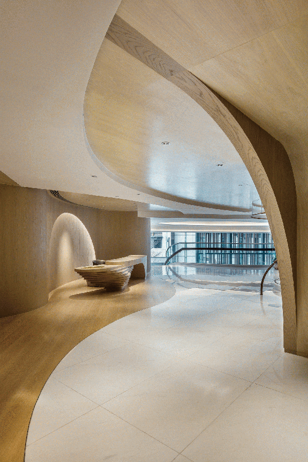 剛步入會所就被旋轉樓梯**至光線充裕猶如隧道般的走廊,咖啡廳內(nèi)的木材優(yōu)美地刻畫出空間的線條,搭配大自然色調(diào)的地毯及特殊的紋理,落地玻璃不僅映入戶外景色增強空間感,并巧妙地打造了與自然光線共生的聚會場所,隨著時間變化而讓光影在空間中翩翩起舞。