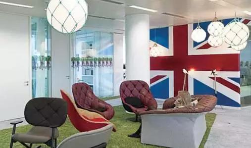 英國倫敦的Google總部到處都有著醒目的英國國旗,室外工作場所被稱為“秘密花園”,包括樹籬包圍的陽臺座椅。燈光挑出來的輪廓熟悉的谷歌標(biāo)志,懸掛在天花板上面的前臺。