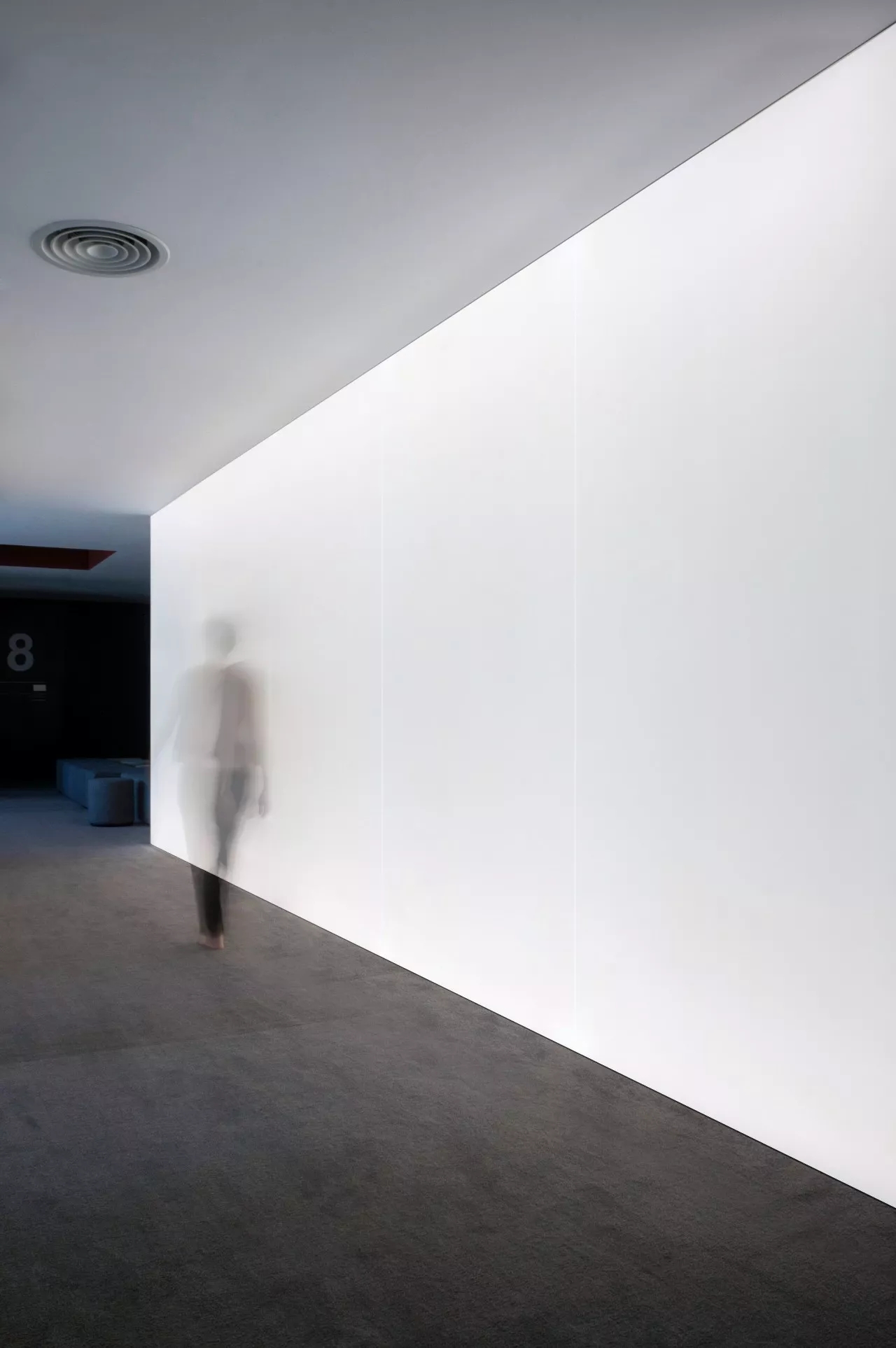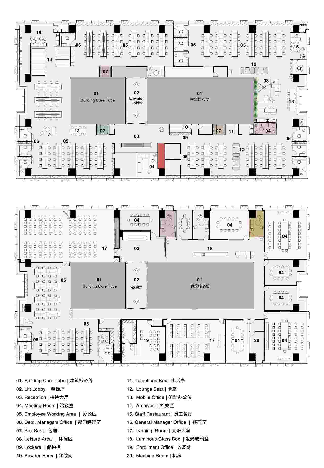 ![]() 中原地產(chǎn)在深圳經(jīng)過(guò)二十年的深耕,目前區(qū)域員工達(dá)到11000多人,是深圳規(guī)模**的專(zhuān)業(yè)地產(chǎn)代理公司。Peng & Partners (P&P)為其位于深圳后海的新總部辦公空間進(jìn)行了大刀闊斧、革命性的設(shè)計(jì)。 ?作為一家港資企業(yè),其過(guò)去20年的發(fā)展中,一直秉承著拼搏進(jìn)取、專(zhuān)業(yè)嚴(yán)謹(jǐn)?shù)南愀劬瘢@也反映在老的辦公空間的形象上。在當(dāng)下的重要時(shí)間節(jié)點(diǎn),企業(yè)希望融合深圳大膽創(chuàng)新的精神,活力、開(kāi)放與協(xié)作。 ![]() 整個(gè)項(xiàng)目包含建筑的四層樓,三層為辦公樓層,另一層為會(huì)務(wù)中心層。 大廳天花頂部的開(kāi)孔與立面的開(kāi)孔相呼應(yīng),呈現(xiàn)豐富而有趣的空間構(gòu)成和層次的延伸感。 ![]() ![]() “盒子”的概念貫穿整個(gè)設(shè)計(jì),通過(guò)相減、擠壓、鑲嵌、堆疊等, 對(duì)基礎(chǔ)的方塊進(jìn)行加工變形,產(chǎn)生不同的正相和負(fù)相空間,以不同組合方式,串聯(lián)起來(lái)。盒子的不同開(kāi)口方向和尺度,呈現(xiàn)出有趣的對(duì)比關(guān)系和節(jié)奏:私密與開(kāi)放、狹窄與舒張、幽暗與明亮… ![]() ![]() ![]() ![]() 每個(gè)單獨(dú)的盒子,被賦予簡(jiǎn)單純粹的色彩和材質(zhì),比如包裹墻面和天花的彩色吸音毛氈,有效降低與其他區(qū)域的相互干擾,實(shí)現(xiàn)**的聲學(xué)效果。人在里面活動(dòng)時(shí),空間和人的關(guān)系,以及人與人的關(guān)系變得更緊密而有趣,同時(shí)獲得一種沉浸式的空間體驗(yàn),使討論或工作變的更放松和專(zhuān)注。 ![]() ![]() ![]() 為了弱化傳統(tǒng)辦公室的緊張氛圍,公共休閑區(qū)配置了特別大的面積,包括大面積的垂直綠化墻、廚房及水吧。成為員工聚會(huì)、休息,或工作交流、頭腦風(fēng)暴的聚集地。模塊化的沙發(fā),能實(shí)現(xiàn)多變的組合方式,以及滿足員工360度全方位的無(wú)障礙溝通。 ![]() ![]() 9㎡部門(mén)經(jīng)理辦公室,在功能布置上做了很大的改變和創(chuàng)新,所有的功能構(gòu)件沿著空間四周墻面布置,儲(chǔ)物、辦公、休閑、閱讀及交流等,非常巧妙的銜接,使得小面積卻擁有寬敞舒適之感。 ![]() ![]() ![]() 會(huì)務(wù)中心層的發(fā)光玻璃墻,滿足了整個(gè)空間的照明,同時(shí)又成為空間的視覺(jué)核心,營(yíng)造出純粹、安靜、脫俗的藝術(shù)辦公空間氛圍。 ![]() ![]() ![]() ![]() ![]() ![]() ![]() ![]() 整體空間的人流動(dòng)線簡(jiǎn)潔清晰,工作交流快速**。 ![]() ![]() ![]() ![]() ![]() 空間的平面指示系統(tǒng)設(shè)計(jì),結(jié)合簡(jiǎn)潔的造型體塊、線條和光線,呈現(xiàn)出耳目一新、時(shí)尚優(yōu)雅的氣質(zhì)。 ![]() ![]() 整個(gè)設(shè)計(jì)過(guò)程中,都在嘗試對(duì)傳統(tǒng)的辦公方式帶來(lái)改變,創(chuàng)造一個(gè)嶄新愉悅的工作體驗(yàn)。 ![]() ![]() ![]() ![]() 平面規(guī)劃: 依據(jù)場(chǎng)地的條件,以及體現(xiàn)企業(yè)文化和對(duì)員工的關(guān)懷,優(yōu)先保證各個(gè)部門(mén)擁有*有利的采光、通風(fēng)和*佳的景觀視野,員工辦公區(qū)域設(shè)置在靠窗的位置,部門(mén)參照柱位劃分。其余的功能區(qū)塊,如儲(chǔ)物、洽談區(qū)、影印室以及電話亭等,沿建筑核心筒集中排列。 ![]() |