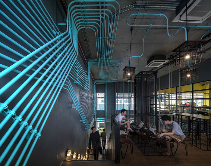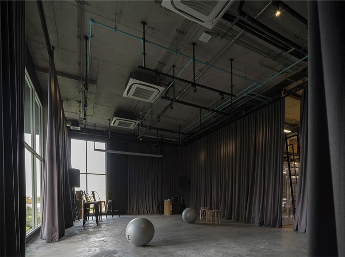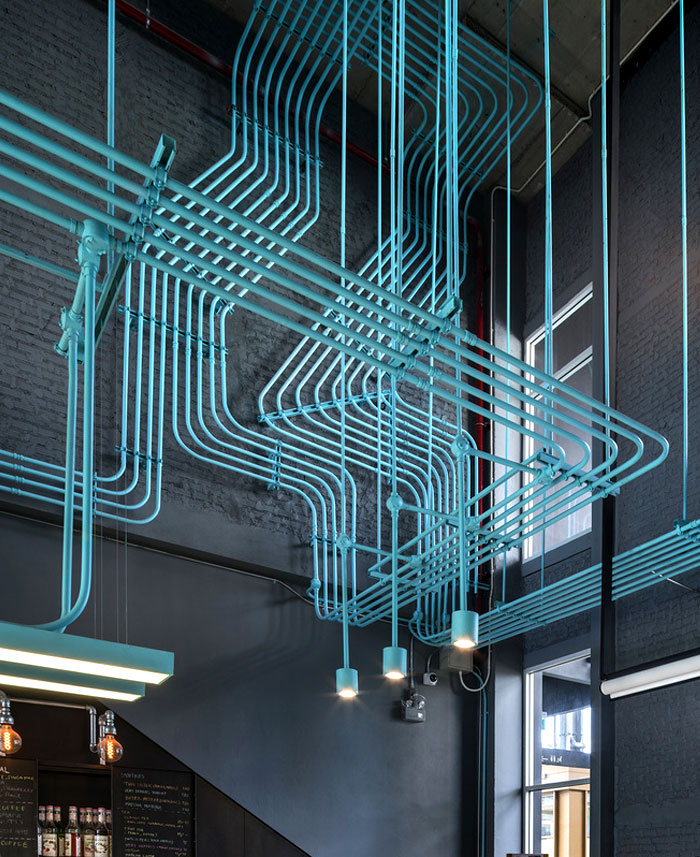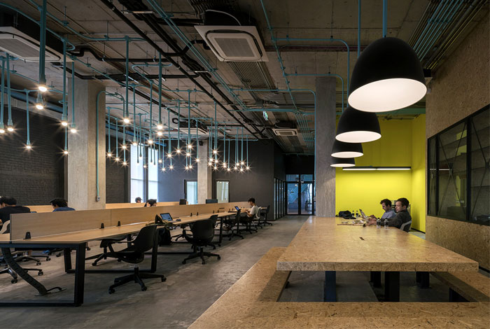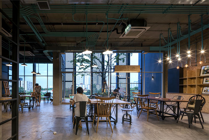 整個(gè) Co-Working Space 面積寬敞,以工業(yè)廠房的形式接待著來(lái)訪的客人,稍經(jīng)修飾的地面與裸露的混凝土立柱,帶來(lái)*為原始、粗獷的空間魅力,一層為咖啡廳,從售賣各種食品的吧臺(tái)到充滿工業(yè)感的桌椅,很難將它與工作空間聯(lián)想到一塊。