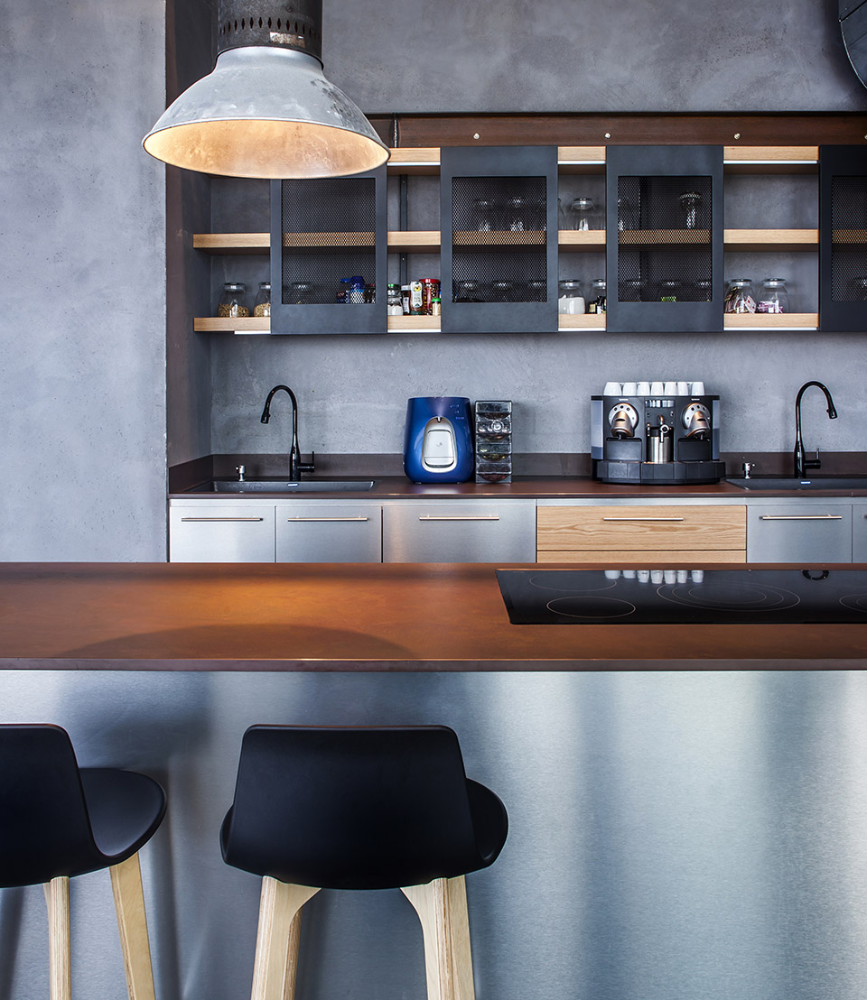 粗糙的原木、不加修飾的混凝土核心筒墻體以及銹色的金屬結(jié)構(gòu)凸顯了這個(gè)辦公空間的工業(yè)氣息?!扒擅畹卦O(shè)計(jì)讓位于城市中心的辦公空間能夠與公司所有數(shù)據(jù)的來源 – 船只發(fā)生了聯(lián)系。我們有意避免了讓人能夠聯(lián)想起豪華游艇的任何元素,而是渲染出一種如同工業(yè)港口般的粗糙氛圍?!笔聞?wù)所創(chuàng)始人Roy David解釋道。