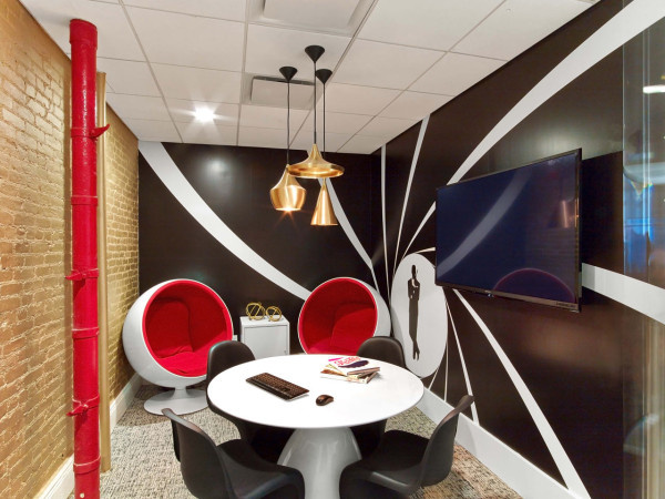 廣告公司辦公室會客區(qū)設計:裸露管道被刷成紅色,同時還設計了窩型的坐椅,很有創(chuàng)意感,墻壁上手繪了黑白線條的裝飾畫,空間布置得很有藝術范兒氣息。公司的VIP會客室設計了玻璃門可以保持大空間的通透感,室內的墻壁和天花板都設計成紫色調的,帶來奢華神秘的視覺感,墻壁上掛著裝飾畫,為空間營造出藝術風氣息。