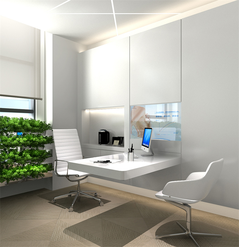 這間獨立辦公室,空間面積不大,但房間形狀規(guī)整。所以設計師在窗邊下臺面做了綠植架設計,純白色的辦公空間添加綠色的植物,空間立刻活力顯現。