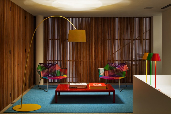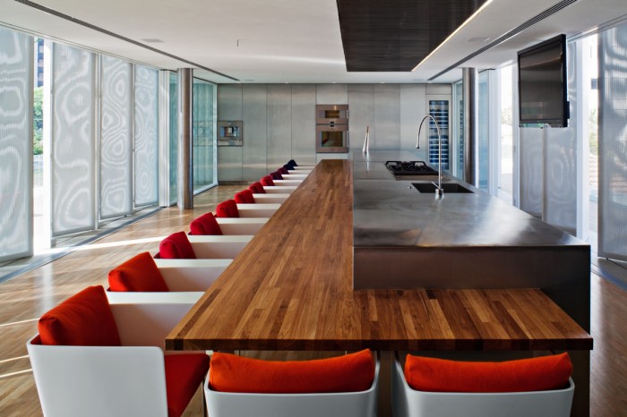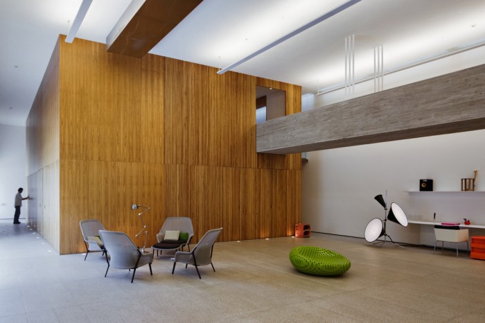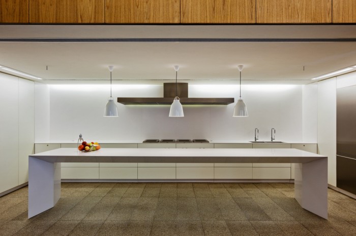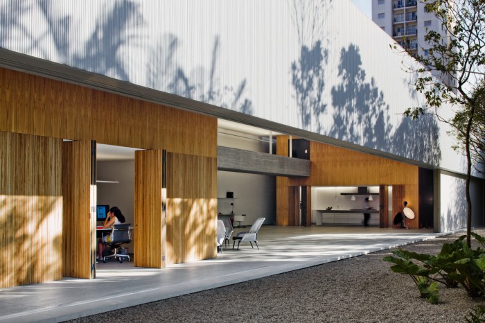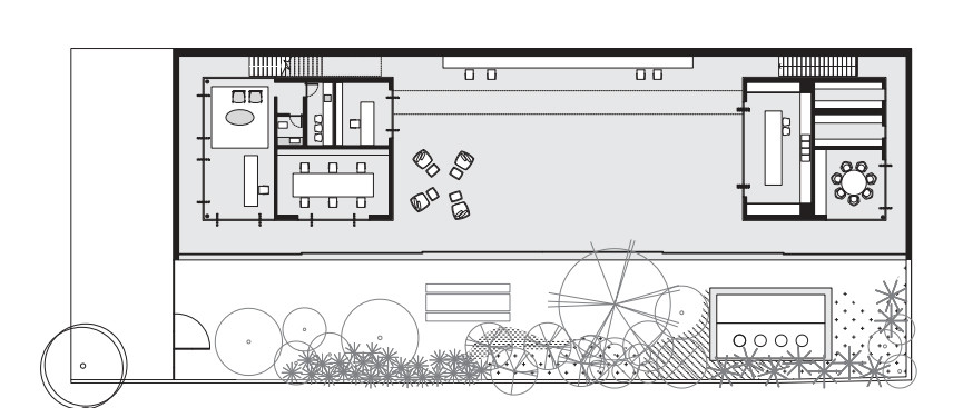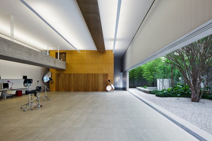千羽工作室的建筑在長方形的土地上被分為兩部分,北部是43.5米長7.2寬的花園,南部為43.5米長12.2米寬的工作室主體結(jié)構(gòu)。工作室的入口在花園一側(cè),通過一排滑動的金屬門可以進入到工作室內(nèi)?;瑒娱T全部打開可以直接與外部花園共享,進入建筑內(nèi)可以看到一個混凝土人行道在空中將兩個木制盒型的空間鏈接,而且具有很強的視覺沖擊力。