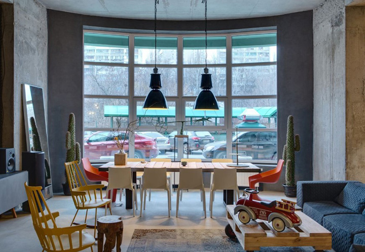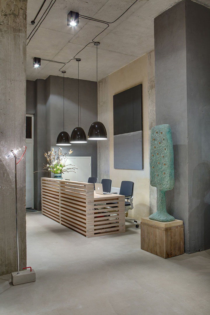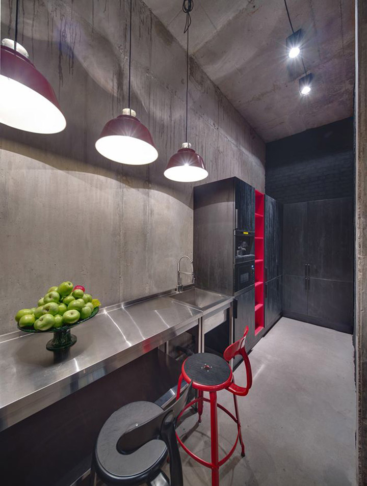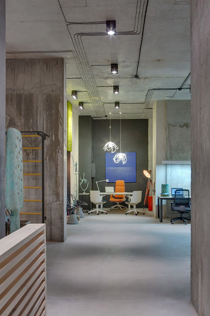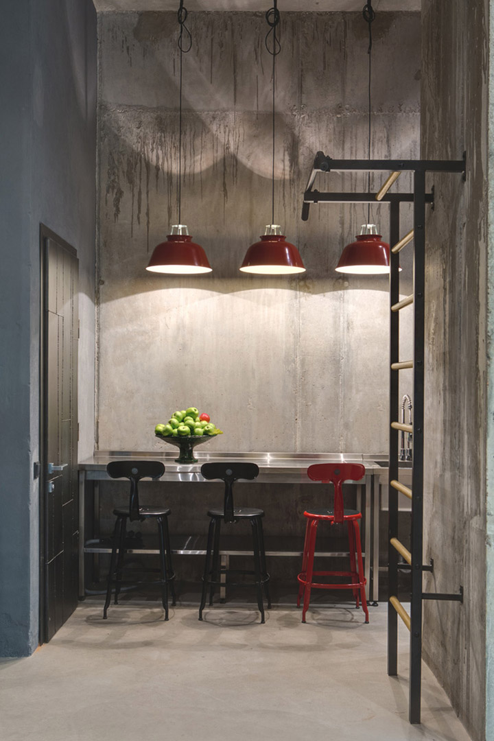 設計師盡量不去改變原有墻體構造,并完全保留原有的水泥墻和水泥頂板。自然原始的材質表面在藝術品的襯托下反而呈現出自然樸素的美感。頂面的管道布線經過仔細編排,為原本平淡無趣的頂面增添了許多設計美感。